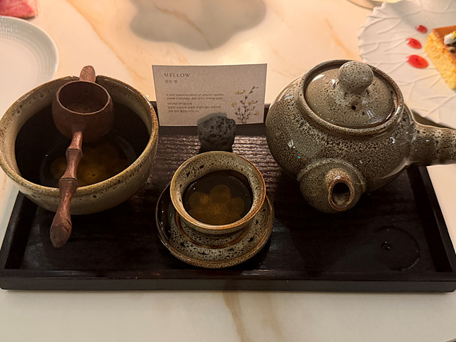 치즈 케익도 같이 주문했었는데 칵테일과는 안 어울리는 것 같아서 맑은 빛 이라는 시그니쳐 티를 주문했다. 루이보스 베이스의 차인데 오렌지 향이 기억에 남는다.