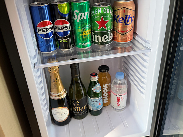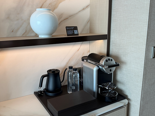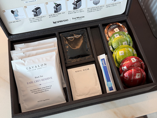 미니바엔 무료 생수 2병과 캡슐 커피, 티백이 있었다. 유료 제품도 있는데 바로 아래가 코엑스라 이용할 일이 없었다.