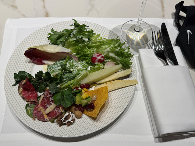 죽이나 수프가 없어서 스파클링에 와인에 샐러드로 시작했다.