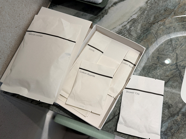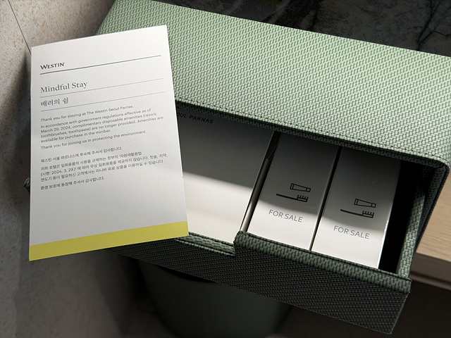 헤어드라이어와 일회용품들이 세면대 아래 상자에 들어 있었다. 일회용품 사용 규제 대상이라 칫솔, 치약, 면도기는 비용이 청구된다.