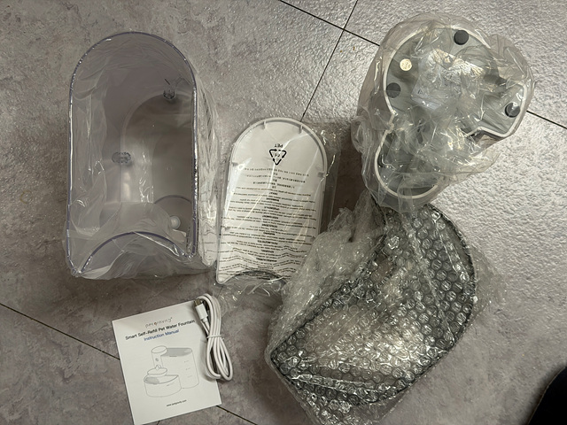 물그릇을 일정 시간마다 비우고 채워주는 구조의 제품이다. 본체, 물통, 물그릇, 물비움통, USB 충전 케이블이 들어 있다.